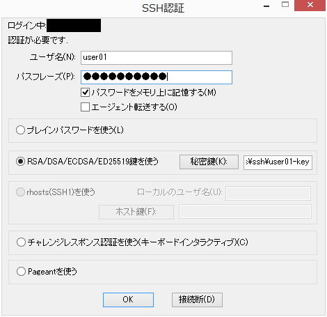 「パスフレーズ」には、秘密鍵と公開鍵のペアの作成時に指定した秘密鍵のパスフレーズを入力します。